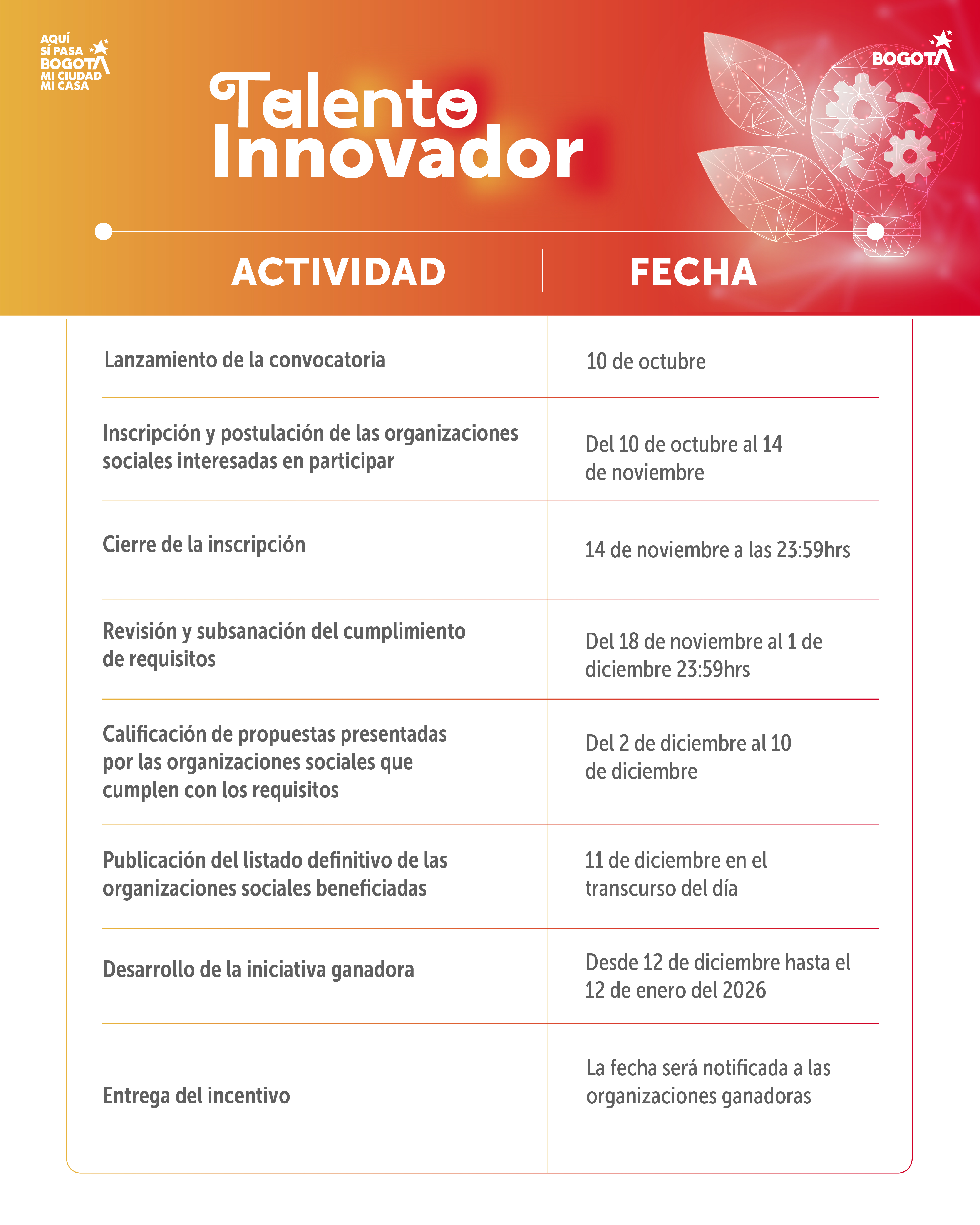 Busca fortalecer la participación ciudadana a través de iniciativas creativas y tecnológicas lideradas por organizaciones sociales, formales o informales. Está dirigida a propuestas que se encuentren en etapa de maduración y que promuevan el empoderamiento, la innovación y el trabajo colectivo en los territorios. Las organizaciones seleccionadas recibirán acompañamiento y herramientas para desarrollar sus proyectos..